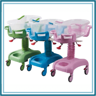 Height and Trenslenburge adjusted by gas spring, Aluminium column, transparent and high-intensity baby basin, High-Low: 980mm 780mm. Three colours for choice: pink, green and blue.